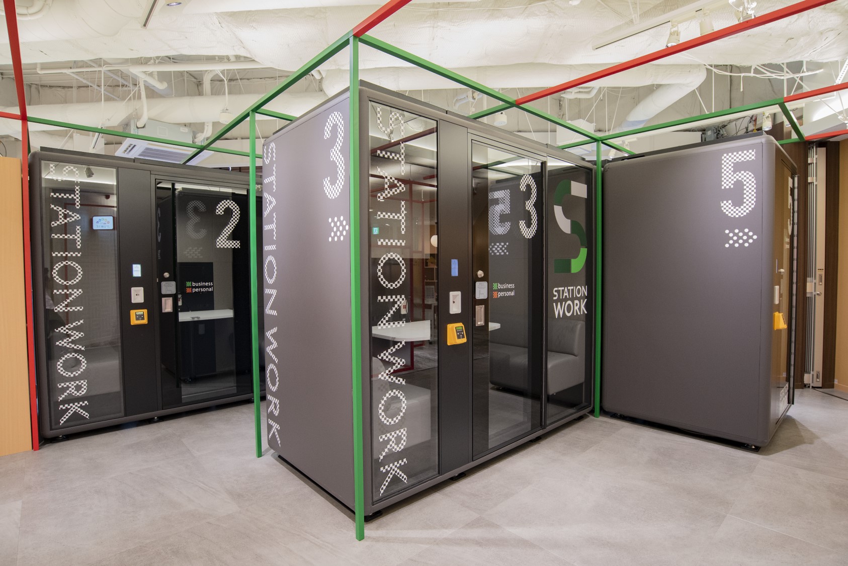 STATION BOOTHはその名の通り個室ブース型のシェアオフィスです。仕事に必須であるデスク・Wi-Fi・電源等が整備されております。また、小規模ながら空調を完備しているので、静かで快適な空間を提供しています。